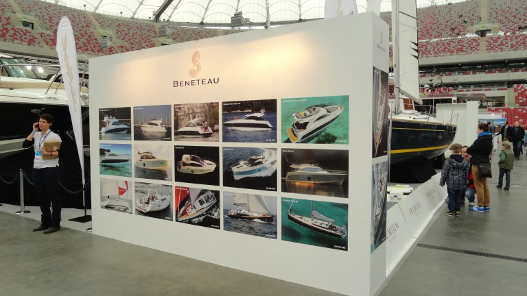 W galerii widać też realizacje oparte o system Octanorm, gdzie ściany działowe i pylony łączą się w jedną bryłę. Moduły tworzą salki spotkań z szybkim dostępem do zasilania i mediów. Taki zestaw łatwo przenieść między wydarzeniami, co cenią działy marketingu. Rozwiązanie wspiera stoiska konferencyjne, a także większe stoiska targowe, które wymagają spójnych nośników. Modułowość skraca montaż i demontaż, a grafika pozostaje w jednym standardzie druku.